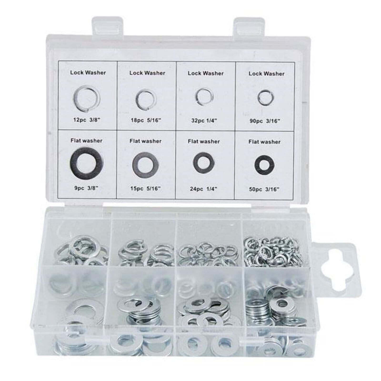 This comprehensive 250-piece Washer Assortment set offers zinc plated Flat and Lock Washers in a range of sizes, conveniently packed into a holding case. The set contains 50 pieces of 3/16", 24 pieces of 1/4", 9 pieces of 3/8" and 15 pieces of 5/16" Flat Washers, as well as 90 pieces of 3/16", 32 pieces of 1/4", 12 pieces of 3/8" and 18 pieces of 5/16" Lock Washers, to provide you with an accessory for any project. The high-quality washers are individually sized and packaged in a clearly labelled case, so you can easily determine which washers you require for your particular job. Now, you can always be sure you have the right Washers on hand for any purpose.